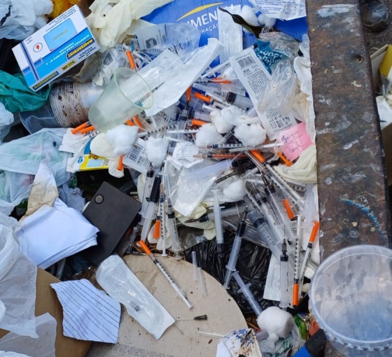 Ampolas, seringas e agulhas foram jogados em caçamba de papa-entulho próximo ao CIMI